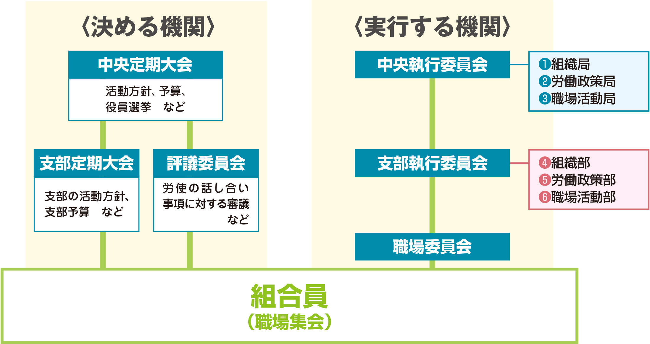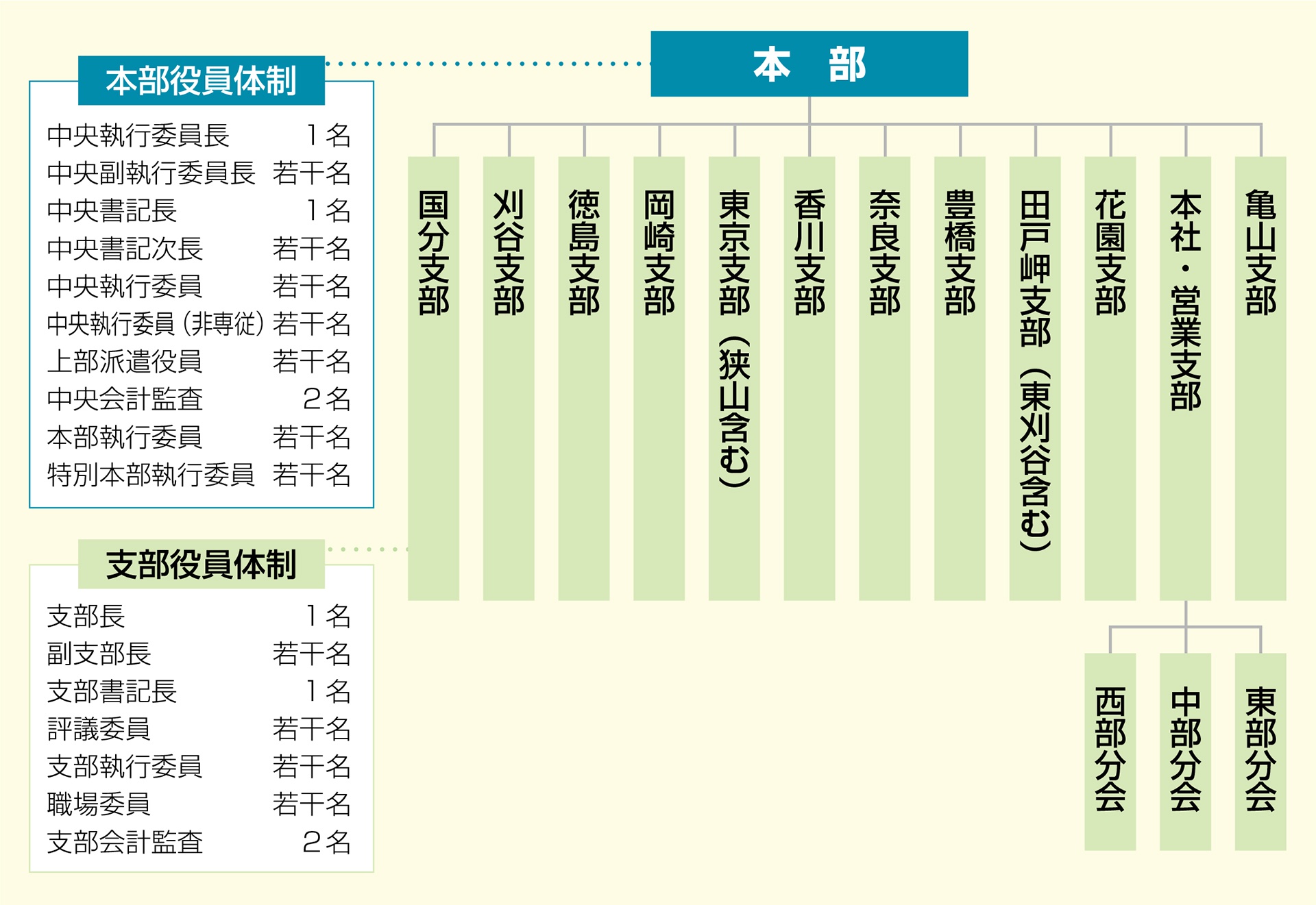 ジェイテクト労働組合では、本部を愛知県刈谷市に置き、工場ごとを基本に支部を設ける支部制を引いています。